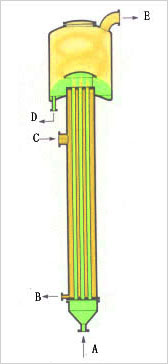 Rising film evaporator The rising film evaporator is also called a climb film evaporator. It operates according to the principle of the siphon pump. According to the lift of the steam bubbles generated during the boiling process, the liquid and the steam flow in parallel, and at the same time, the amount of steam generated increases, thereby A flowing membrane is created on the wall of the tube, ie the liquid "crawls up". The parallel flow movement is ribbed to create a high degree of turbulence in the liquid. This type of evaporator is characterized by a long heating tube (about 5 to 7 M), but the temperature difference between the heating chamber and the boiling chamber must also be large. Otherwise, the energy of the steam flow is insufficient to transport the liquid and produce a climbing film. . A:Material import B:Condensate outlet C:Condensate outlet D:Concentrate outlet E:Secondary steam outlet ![]() Falling film evaporator In the falling film evaporator, the liquid and the steam flow in parallel, the concentrated liquid is preheated to the boiling temperature, and the uniform liquid film enters the heating pipe through the liquid distribution device on the top of the evaporator, and flows downward at the boiling temperature. And partially evaporating, the gravity introduced by the downward movement is continuously strengthened by the cocurrent steam flow. In a falling film evaporator, it is extremely important to fully wet the liquid to heat the surface to face the trouble-free operation of the device. If the heating surface is not sufficiently wetted, local drywall and crusts will occur, and the bad condition is that the heating tube will be completely blocked. In critical cases, the wetting rate increases as the evaporator efficiency increases or divides, so the advantages of single pass operation should be maintained. In this mode of operation, the contact time of the liquid and the heating surface is almost constant, usually in the order of seconds. In addition to the tube size, the selection of a suitable liquid distribution device is important to achieve complete wetting. The following figures illustrate two liquid distribution devices. Due to the low amount of liquid in the heating tube and the fast flow rate, the product residence time is quite short, so that the heat sensitive material can be evaporated extremely gently. ![]() |