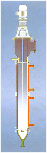 一、概述 薄膜蒸發器是通過旋轉刮膜器強制成膜,并高速流動,熱傳遞效率高,停留時間短(約10~50秒),可在真空條件下進行降膜蒸發的一種新型高效蒸發器。 它由一個或多個帶夾套加熱的圓筒體及筒內旋轉的刮膜器組成。刮膜器將進料連續地在加熱面刮成厚薄均勻的液膜并向下移動;在此過程中,低沸點的組份被蒸發,而殘留物從蒸發器底部排出。 二、性能特點 ·真空壓降小: 物料汽化氣體從加熱面送到外置的冷凝器,存在一定的壓差。在一般的蒸發器中,這種壓力降(Δp)通常是比較高的,有時甚至高得難于接受。而刮板式薄膜蒸發器有較大的氣體穿越空間,蒸發器內壓力能看成與冷凝器中的壓力幾乎相等,因此,壓力降很小,真空度可達5mmHg。 ·操作溫度低: 由于上述特性,這使得蒸發過程可以保持在較高真空度條件下進行。由于真空度的提高,與之相應的物料沸點迅速降低,因此,操作可以在較低溫度下進行,降低了產品的熱分解。 ·受熱時間短: 由于刮板式薄膜蒸發器的獨特結構,刮膜器具有泵送作用,使得物料在蒸發器內的停留時間很短;另,在加熱的蒸發器上由于薄膜的高速湍流使得產品不會滯留在蒸發器表面。因此,特別適用于熱敏性物料的蒸發。 ·蒸發強度高: 物料沸點的降低,增大了同熱介質的溫度差;刮膜器的功能,減小了呈現湍流狀態的液膜厚度,降低了熱阻。同時,在這過程中抑制物料在加熱面結壁、結垢,并伴有良好的熱交換,因此,提高了刮板式薄膜蒸發器的總傳熱系數。 ![]() ·操作彈性大: 正是由于刮板式薄膜蒸發器獨有的性能,使其適宜于處理熱敏性和要求平穩蒸發的、高粘度的及隨濃度提高粘度急劇增加的物料,其蒸發過程也能平穩蒸發。 它還能成功地應用于含固顆粒、結晶、聚合、結垢等情況物料的蒸發和蒸餾。 三、應用領域 在熱交換工程中,刮板式薄膜蒸發器得到廣乏的應用。尤其對熱敏性物料(時間短暫)的熱交換,刮膜器有利于熱交換的進行,并通過不同的刮膜器設計,能進行復雜產品的蒸餾。 刮膜蒸發器已在下述領域用于蒸發濃縮、脫溶、汽提、反應、脫氣、除臭(氣)味等為目的,取得了良好效果: 中、西藥:抗生素,糖液,雷公滕、黃芪等中草藥,甲基咪唑、單腈胺等中間體; 輕工食品:果汁,肉汁,色素,香精,香料,酶制劑、乳酸、木糖、淀粉糖,山梨酸鉀; 油脂日化:卵磷酯,VE,魚肝油,油酸,甘油,脂肪酸,廢潤滑油,烷基多糖苷,醇醚硫酸鹽等; 合成樹脂:聚酰胺樹脂,環氧樹脂,多聚甲醛,PPS(癸二酸聚丙烯酯),PBT,甲酸丙烯酯; 合成纖維:PTA,DMT,炭素纖維,聚四氫呋喃,聚醚多元醇等; 石油化學:TDI,MDI,三甲基氫醌,三羥甲基丙烷,氫氧化鈉等; 農藥生物:乙草胺、丙草胺、毒死蜱、呋喃酚、廣滅靈、等除草劑,殺蟲劑、除莠劑,除螨劑; 廢 水:無機鹽廢水等; 四、工作原理 物料從加熱區的上方徑向進入蒸發器;經布料器分布到蒸發器加熱壁面,然后,旋轉的刮膜器將物料連續均勻地加熱面上刮成厚薄均勻的液膜,并以螺旋狀向下推進。在此過程中,旋轉的刮膜器連續和均勻的液膜產生高速湍流,并阻止液膜在加熱面結焦、結垢,從而提高傳總系數。輕組份被蒸發形成蒸汽流上升,經汽液分離器到達和蒸發器直接相連的外置冷凝器;重組份從蒸發器底部的錐體排出。 一個獨特的布料器不僅僅具有將物料均勻地潑向蒸發器內壁,防止物料濺到蒸發器內部噴入蒸汽流,還具有防止剛進入的物料在此處閃蒸,有利于泡沫的消除,物料只能沿著加熱面蒸發。 在刮膜蒸發器的上部配有一個依據物料特性設計的離心式分離器,將上升蒸汽流中的液滴分離出來并返回布料器。 五、型號、規格